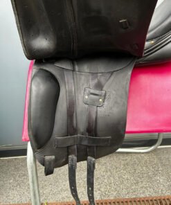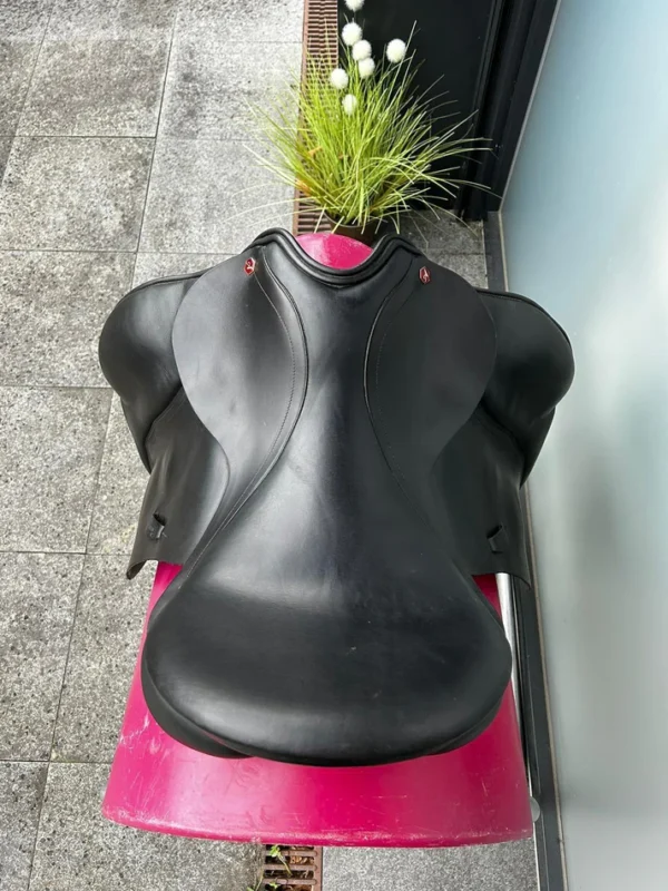 Im täglichen Einsatz wird der Sattel direkt auf dem Pferderücken platziert, mit einer passenden Sattelunterlage kombiniert und über lange Gurtstrippen befestigt. Die langen Gurtstrippen halten die Schnallen weit unterhalb des Ellbogens und lassen den Schenkelsitz vollständig ungestört, was im Dressurreiten wo ein ruhiger langer Unterschenkel das Fundament jeder Hilfe ist direkt spürbar wird.