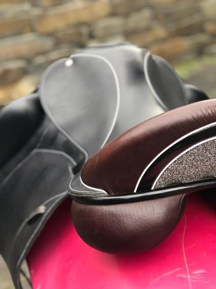 Custom Saddlery ist eine amerikanische Sattelmanufaktur die in der internationalen Dressurszene einen festen Platz hat. Die Marke ist bekannt dafür Sättel zu bauen die nicht nur funktionieren sondern auch optisch eine Aussage machen. Der Icon Alpha ist ein gutes Beispiel dafür. Schnur und Rahmen in Lack Schwarz, Keder in Weiß, Halbmond in Glitzer. Das ist kein zufälliges Designpaket, das ist ein Sattel der weiß was er ist und es zeigt.