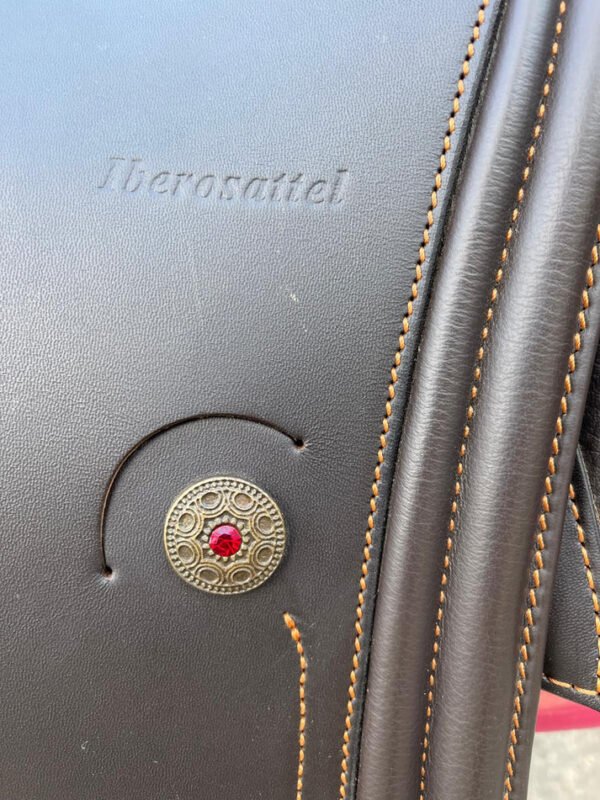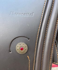 Die volldoublierten untenliegenden festen Pauschen sind ein Detail das den Cordoba von vielen Dressursätteln unterscheidet. Untenliegende Pauschen geben dem Reiter Halt ohne sichtbar aus dem Sattelblatt hervorzustehen, was einen saubereren, engeren Schenkelsitz ermöglicht. Die verdeckte Amazonalösung ist ein weiteres Iberosattel Markenzeichen das die Optik des Sattels sauber hält indem der Steigbügelriemen unsichtbar geführt wird.