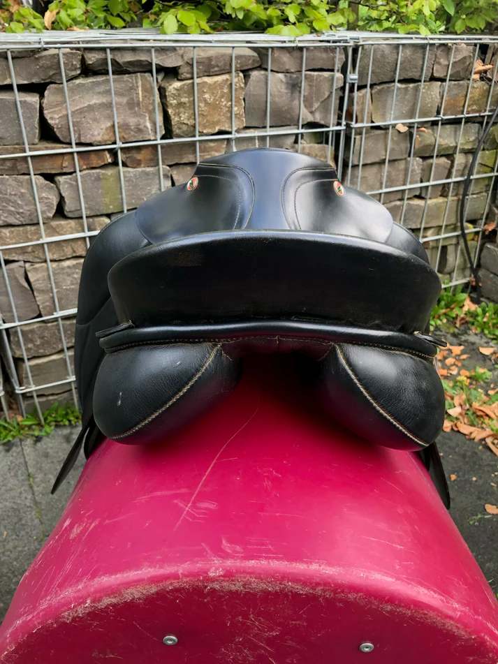 Der Vorschnitt des Sattelblatts ermöglicht Variationen in der Bügelriemenlänge, was für Reiter mit unterschiedlichen Oberschenkellängen oder wechselnden Reitpositionen ein praktischer Vorteil ist. Im täglichen Einsatz wird der Sattel direkt auf dem Pferderücken platziert, mit einer passenden Sattelunterlage kombiniert und über lange Gurtstrippen befestigt. Die langen Gurtstrippen halten die Schnallen weit unterhalb des Ellbogens und lassen den Schenkelsitz ungestört, was im Dressurreiten wo ein ruhiger langer Unterschenkel das Fundament jeder Hilfe ist direkt spürbar wird. Die festen Pauschen geben dem Oberschenkel klaren definierten Halt. Zusätzlich zur Kopfeisenflexibilität ist der Sattel über die Polsterung vor Ort anpassbar, was bei Veränderungen der Pferdemuskulatur weiteren Spielraum gibt.