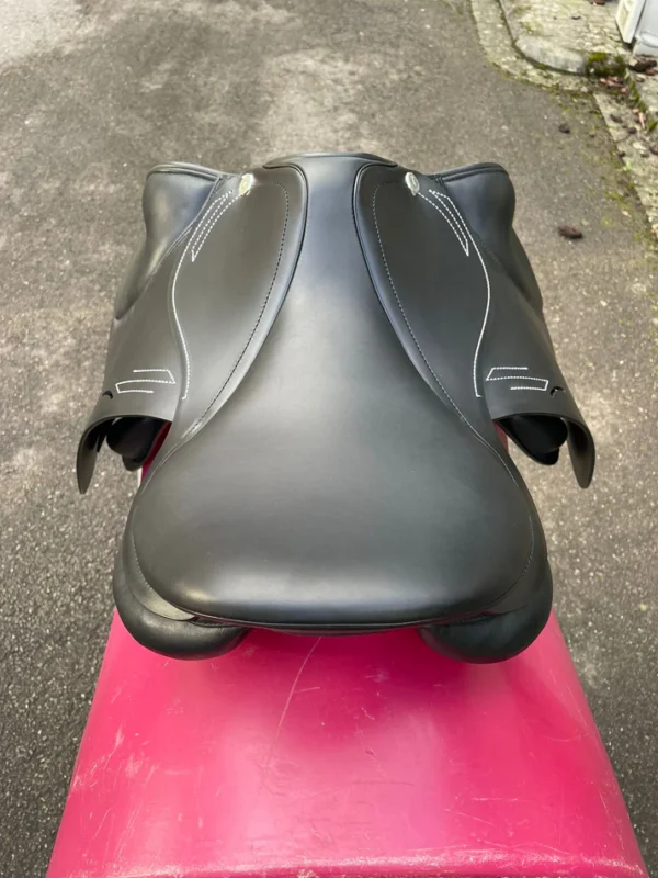 Im täglichen Einsatz wird der Sattel direkt auf dem Pferderücken platziert, mit einer passenden Sattelunterlage kombiniert und über kurze Gurtstrippen befestigt. Die festen Pauschen geben dem Reiter beim Absprung und in der Luft definierten Halt. Die weißen Nähte setzen einen eleganten optischen Akzent der den schwarzen Sattel klar von der Masse abhebt.