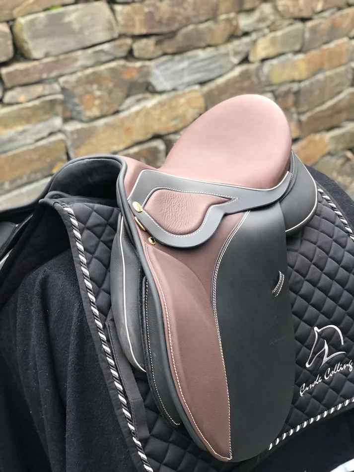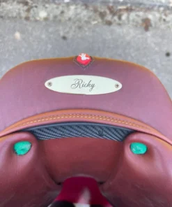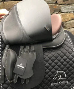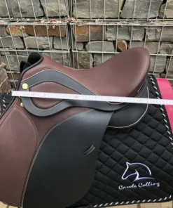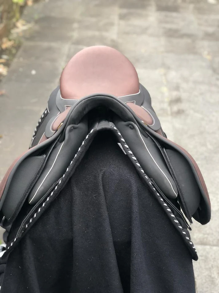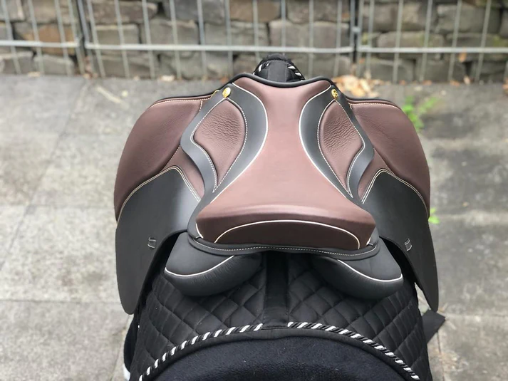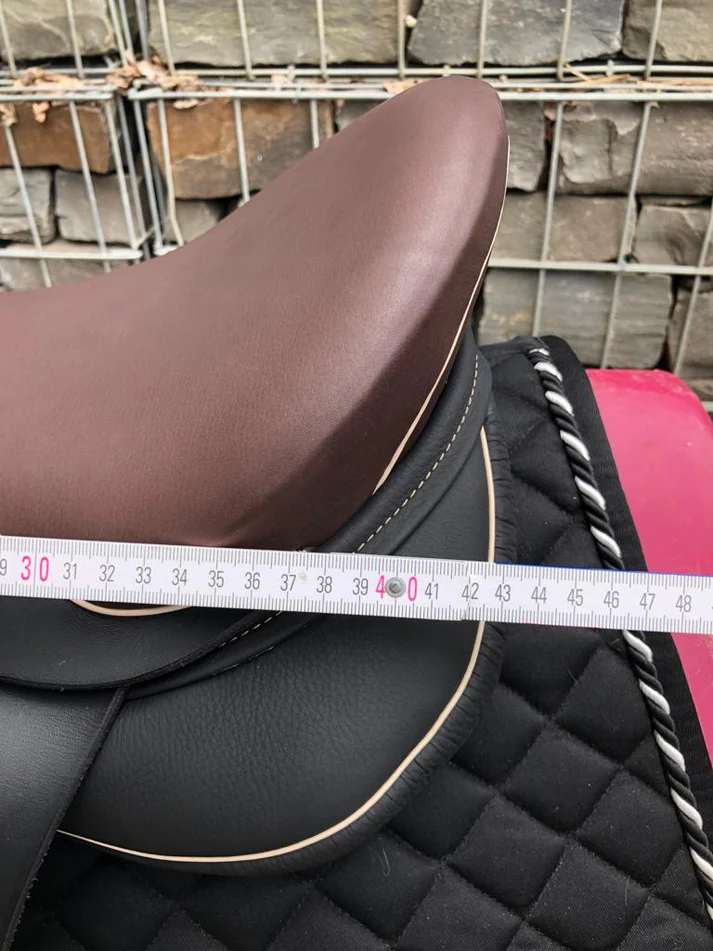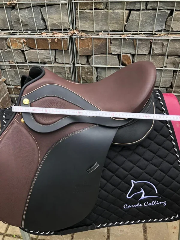 Identische Designsprache wie der 17,5″ Schwarz (Sattelnummer 2201064) – Messing Beschläge, Moro-farbene Knie-, Sitz- und Taschendetails, Champagner Keder und Nähte – jedoch in der kleineren 17″ Sitzfläche und mit leicht abweichender Auflagefläche von 43 cm gegenüber 46 cm beim 17,5″ Modell.