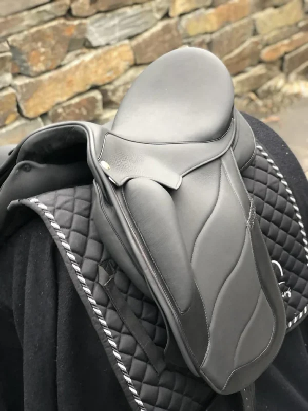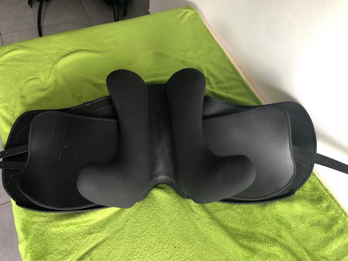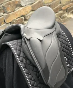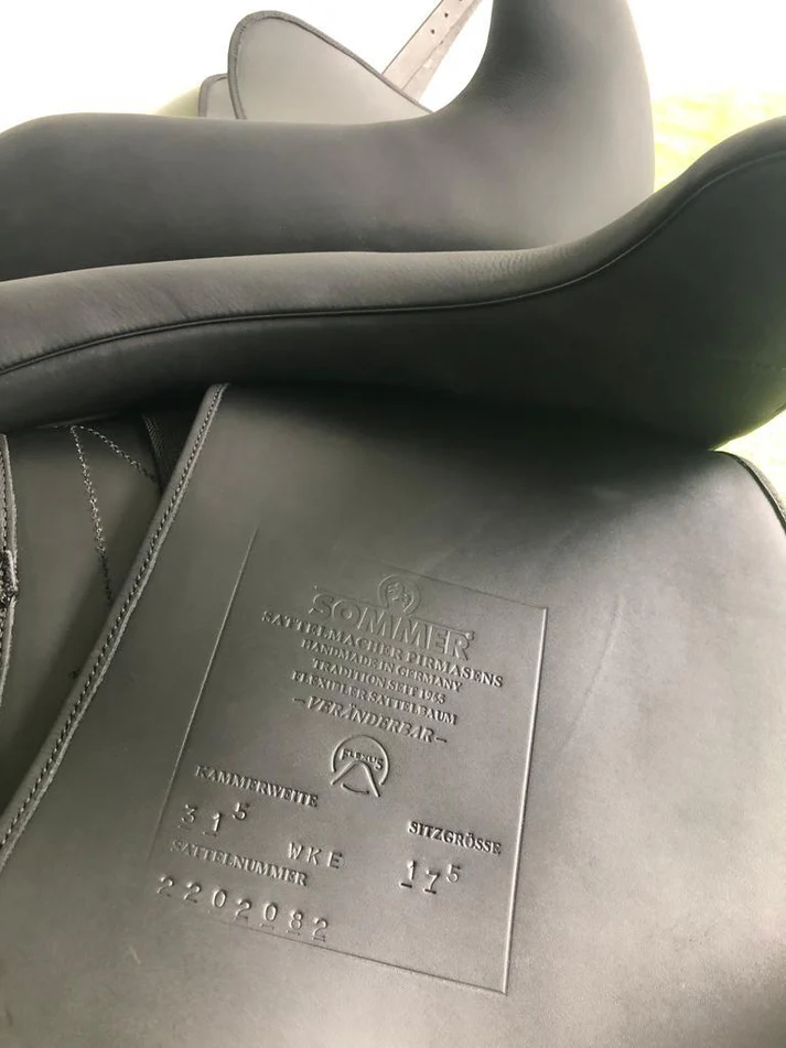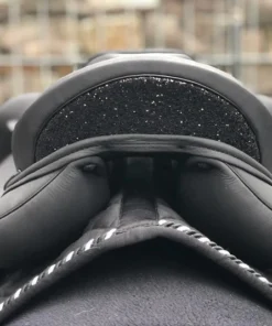 Sommer Tosca 17,5″ Schwarz Galaxy Glitzer Dressursattel NEU – ein Dressursattel der Working Equitation Reiter und anspruchsvolle Dressurreiter gleichermassen anspricht. Flexus WKE Baum, halbtiefem Sitz mit großen aufgesetzten Pauschen für Monoblattfeeling, Protection Kissen mit Wollfüllung, Incusa Leder für besseren Halt, 10-Kammer Kopfeisen, exklusive Steppung auf leicht vorgeschnittenem Sattelblatt. Blattschlaufe und Halbmond in Galaxy Glitzer. Auflagefläche 44 cm, Kammerweite 31,5 cm, für alle Pferde geeignet. Brandneu auf satteldeutschland.de bestellen.