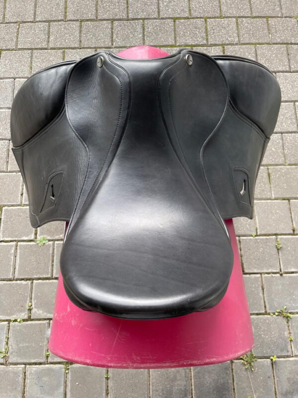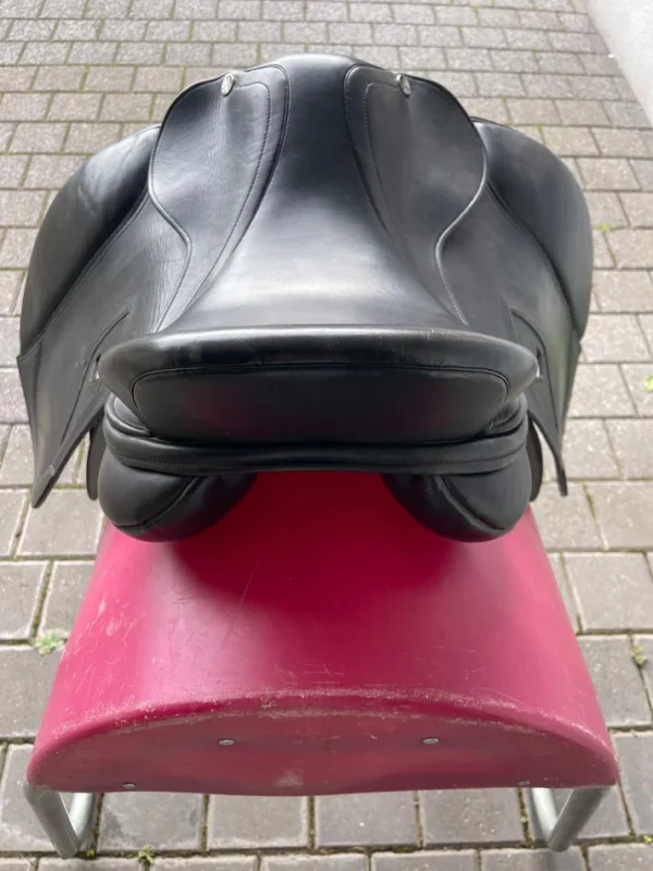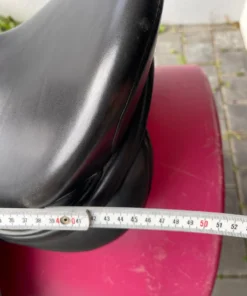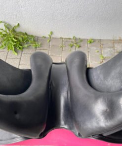 Das Keilkissen mit Wollfüllung passt sich dem Pferderücken natürlich an und sorgt für gleichmäßige Druckverteilung über die gesamte Auflagefläche von 44,5 cm. Im täglichen Einsatz wird der Sattel direkt auf dem Pferderücken platziert, mit einer passenden Sattelunterlage kombiniert und über lange Gurtstrippen befestigt. Die langen Gurtstrippen halten die Schnallen weit unterhalb des Ellbogens und lassen den Schenkelsitz ungestört, was im Dressurreiten wo ein ruhiger langer Unterschenkel das Fundament jeder Hilfe ist direkt spürbar wird.